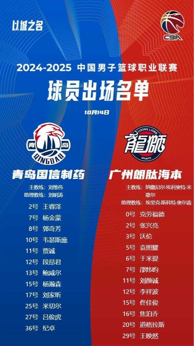 刚刚注册的韦瑟斯庞在列,杨瀚森领衔青岛男篮,广州这边5号秀邵炜昀在列,三外援均登场。