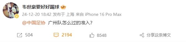 韦世豪在社媒发文质疑:“广州队怎么过的准入?”杨立瑜、严鼎皓等人转发了这条微博。随后沧州雄狮球员郑凯木也发文质疑为何沧州雄狮可以过准入名单。