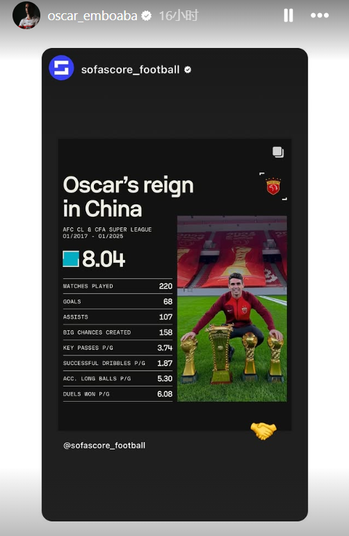 雷速体育12月25日讯 奥斯卡在昨日正式官宣离开上海海港,自由身回到圣保罗。随后奥斯卡在自己的社媒转发自己上海海港生涯的sofascore评分及数据,具体如下: