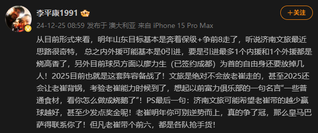 李平康写道:“从目前形式来看,明年山东目标基本是奔着保级+争前8走了,听说济南文旅最近思路很奇特, 总之内外援可能基本是0引进,要是引进最多1个内援和1个外援都是烧高香了,另外目前球员方面以廖力生(已签约成都)为首的自由身还要放掉几人!2025目前也就是这套阵容备战了!”