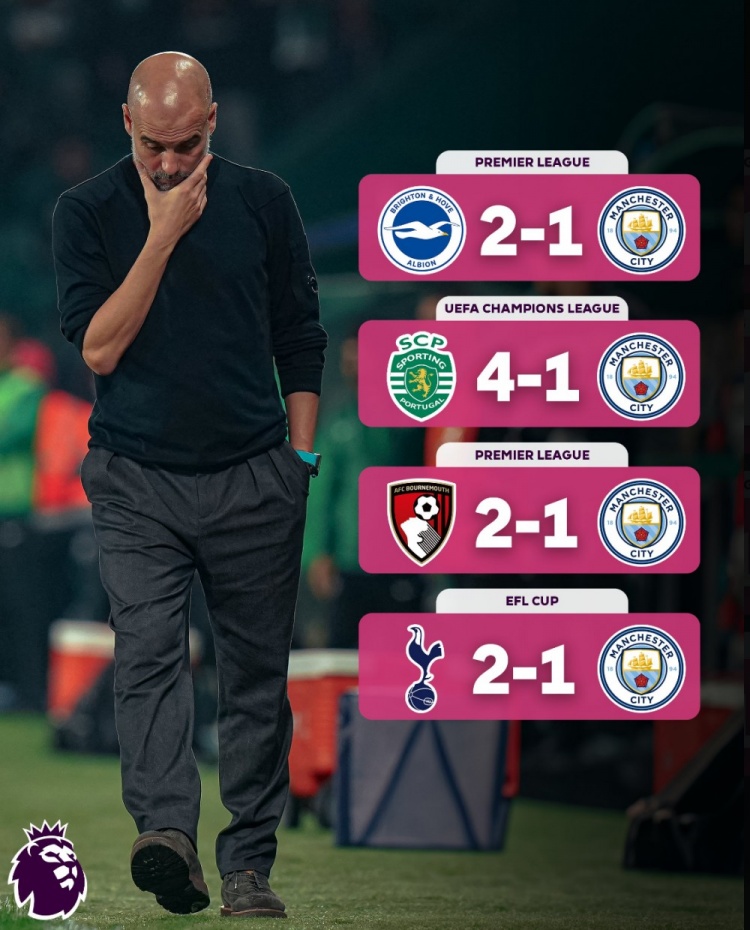 曼城近期战绩不佳,各项赛事遭遇4连败。这也是瓜迪奥拉生涯首次带队4连败。