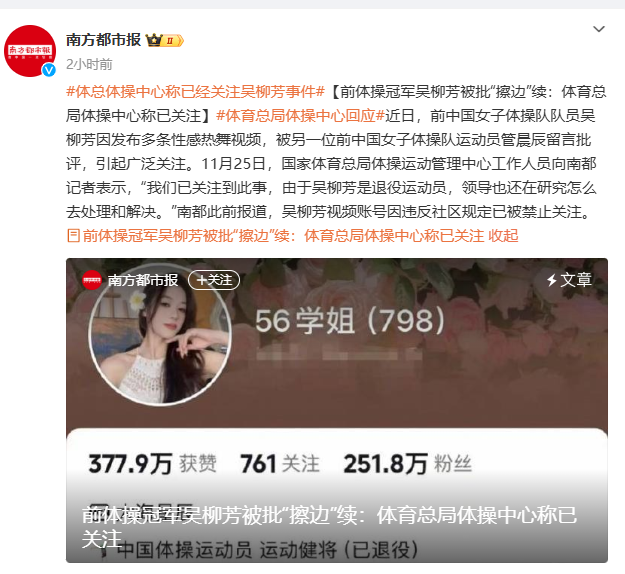 👀南都:前体操冠军吴柳芳被批“擦边”,体育总局体操中心称已关注